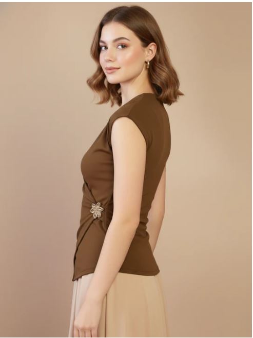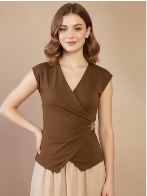 Classic meets contemporary in the Stretchable Gold Accent Wrap Top. Featuring a flattering V-neck wrap silhouette, this top cinches gently at the waist to create a beautifully contoured fit. The bold color adds a timeless appeal, while the decorative side embellishment lends just the right hint of elegance. Crafted from lightweight, breathable fabric, it’s designed for all-day comfort with a polished finish.